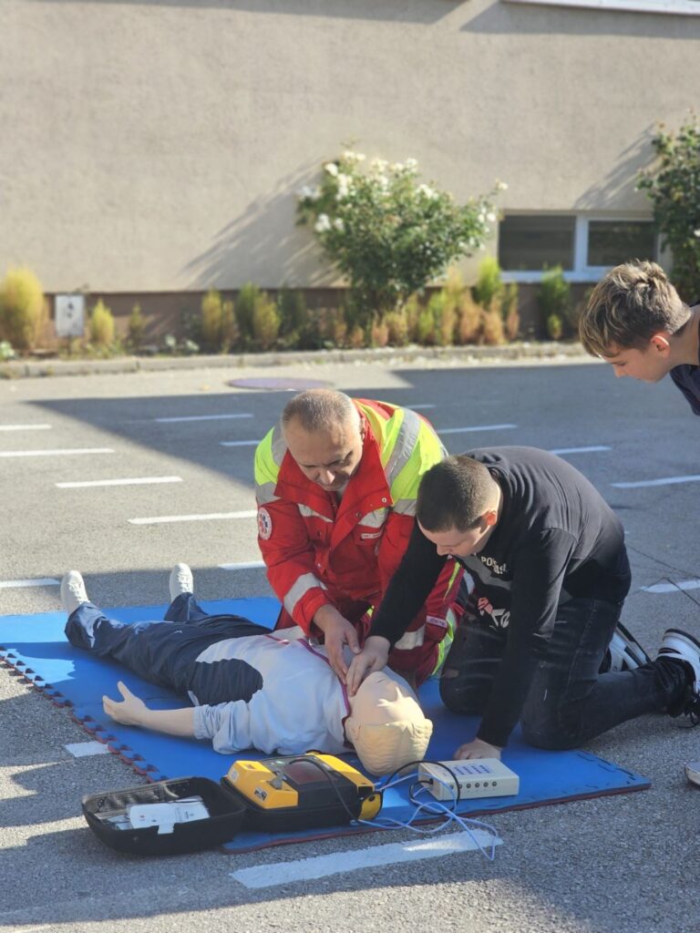 Povodom Svjetskog dana reanimacije, 16. oktobra 2025. godine, u našoj školi je održana edukativna radionica za nastavnike i učenike na temu osnovnih mjera održavanja života i pravilne upotrebe AED uređaja.