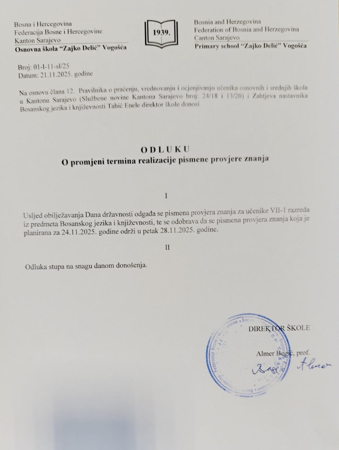 Odluke o promjeni termina realizacije pismenih provjera znanja Odluka o promjeni termina realizacije pismene provjere znanja, Moja okolina, 28.10.2025.Download Odluka o promjeni termina realizacije pismene provjere znanja, Matematika, VIII-3, 27.10.2025.Download Odluka o promjeni termina realizacije pismenih provjera znanja, 19.11.2025.Download Odluka o promjeni termina realizacije pismene provjere znanja, Bosanski jezik i književnost, VII-1, 28.11.2025.Download Odluka o promjeni termina realizacije pismene provjere znanja, Matematika VIII-2 27.11.25Download