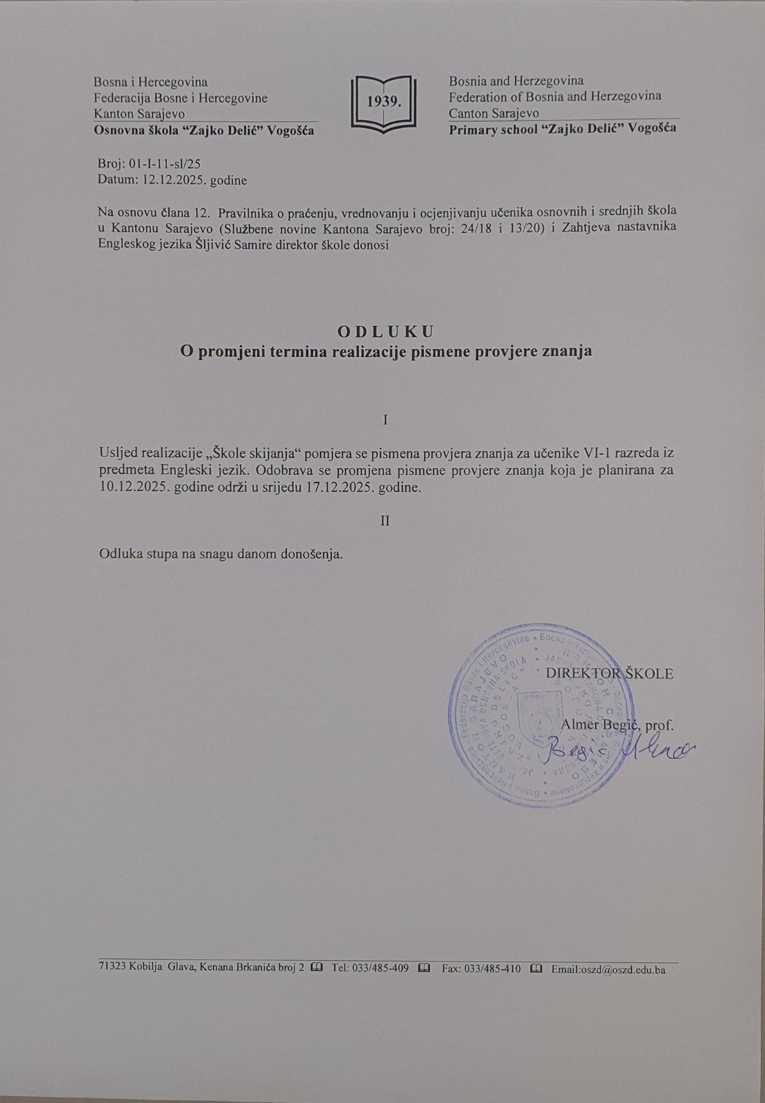 Odluke o promjeni termina realizacije pismenih provjera znanja Odluka o promjeni termina realizacije pismene provjere znanja, Moja okolina, 28.10.2025.Download Odluka o promjeni termina realizacije pismene provjere znanja, Matematika, VIII-3, 27.10.2025.Download Odluka o promjeni termina realizacije pismenih provjera znanja, 19.11.2025.Download Odluka o promjeni termina realizacije pismene provjere znanja, Bosanski jezik i književnost, VII-1, 28.11.2025.Download Odluka o promjeni termina realizacije pismene provjere znanja, Matematika VIII-2 27.11.25Download Odluka o promjeni termina realizacije pismene provjere znanja, Engleski jezik, VI-1, 17.12.2025.Download Odluka o promjeni termina realizacije pismene provjere znanja iz Matematike za VI 2, 23.12.2025. Download